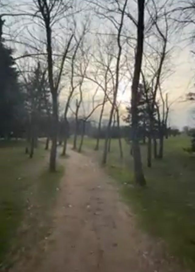 ground-level view of a dirt path winding through a park or wooded area. There are trees on either side of the path, most without leaves. The ground is a mix of dirt and patches of green grass. The sun is low on the horizon, visible through the trees, creating a muted, slightly overcast light. The camera moves slightly forward.