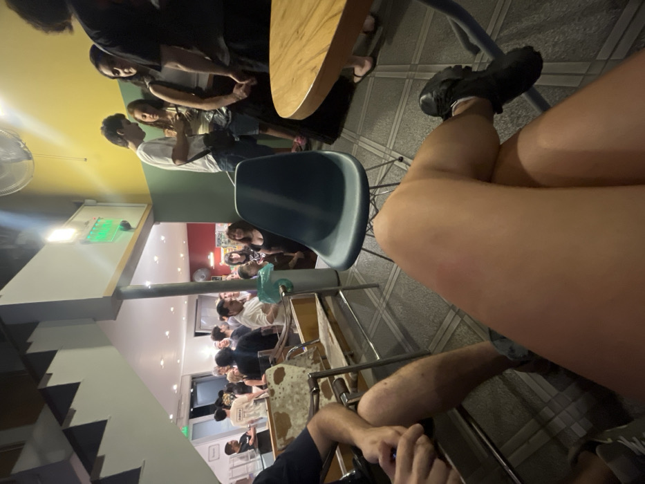 A slightly tilted, low-angle shot shows a crowded bar scene. In the background, people stand near a counter. The foreground is dominated by a person's legs, one crossed over the other, with a chunky black sneaker on the raised foot. A blue chair sits to the left. The floor is tiled in a geometric pattern. A table edge is visible near the top of the frame. The overall lighting is bright.