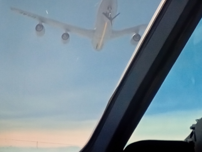 The image presents an aerial view captured from an aircraft cockpit, indicated by a prominent dark vertical strut and the curve of a windshield in the foreground. Above and centered, a large, light-colored four-engine jet aircraft is observed from below and behind, with two engines clearly visible under each wing. An extended refueling boom/probe projects from the rear underside of this lead aircraft, suggesting an aerial refueling operation or formation flight. The background consists of a clear sky, transitioning from a light blue hue at the top to a paler, almost white or light peach tone near the bottom. The scene is situated in the city of Jos, Nigeria.