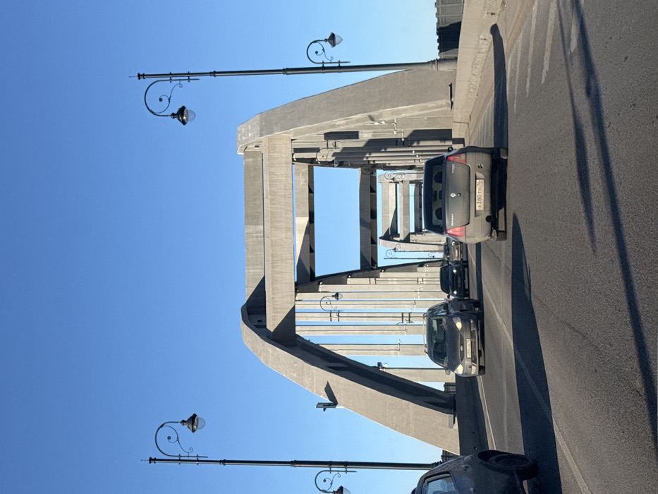 This image depicts a daytime scene on the Rybinsk bridge, specifically the concrete arch bridge over the Volga River in Rybinsk, Russia. The perspective is from inside a vehicle moving forward on the multi-lane asphalt road surface. The sky is clear and blue, with no clouds, and bright sunlight casts distinct, elongated shadows of vehicles and lampposts onto the road. In the immediate foreground, to the left, a portion of a grey hatchback is visible. In the left lane, a dark grey Ford minivan (license plate O 374 KH 76) proceeds with its headlights illuminated. To its right, in the adjacent lane, a grey Renault Logan sedan (license plate A 380 TM 76) is viewed from the rear. Further ahead, several other vehicles, including a dark SUV and additional sedans, are visible, receding into the distance towards the bridge arches. The bridge structure is composed of massive, angular concrete arches and vertical support pillars. Ornate black lampposts, each featuring two scrolled light fixtures with domed luminaires, are spaced along both sides of the roadway, extending into the background. No individuals are visible. The scene suggests typical daytime vehicular traffic flow on the bridge.