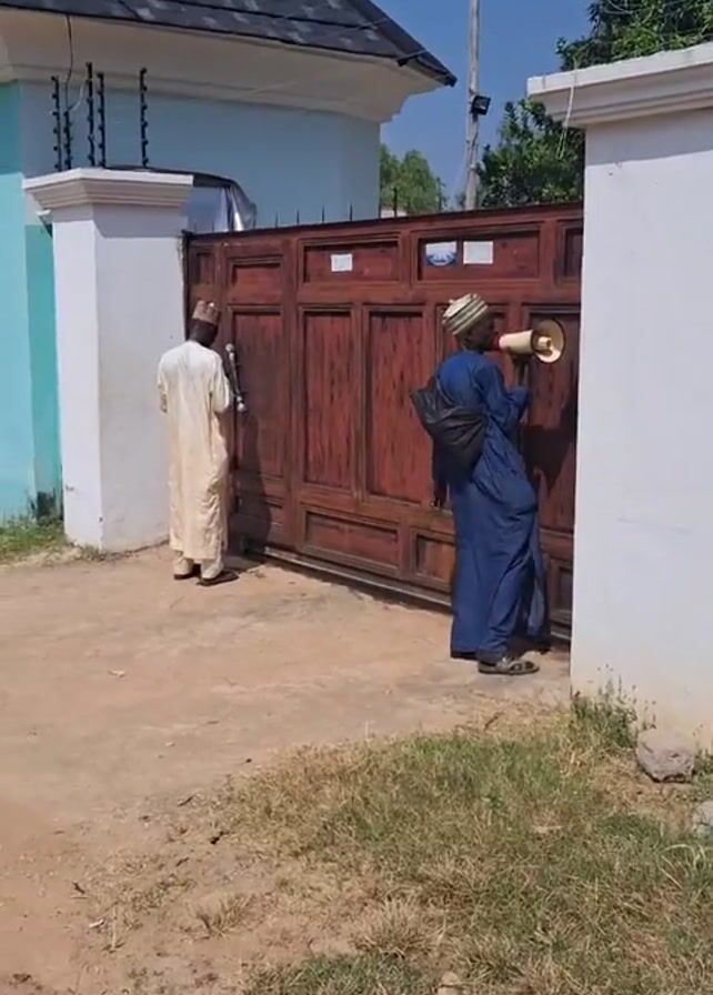Two men stand in front of a large, dark red gate between white pillars, one holding a megaphone to the gate while the other stands beside him holding a similar object. They both wear long robes and traditional caps. The man on the right wears a blue robe and a satchel over his shoulder. The man on the left wears a light tan robe. A portion of a light blue house with a dark roof is visible behind them. A dirt path is under their feet, and a patch of grass grows in the foreground. Overhead power lines are visible in the background. The day is sunny and clear.