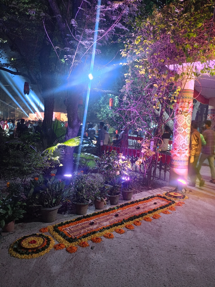 The image depicts an outdoor nighttime event in Dhaka, Bangladesh. In the foreground, a long, rectangular floral arrangement, primarily composed of orange, yellow, and green petals with circular motifs, lies on a light-colored paved surface. Several small, dark, circular objects (possibly oil lamps) are embedded within the central section of this arrangement. To the left of the floral path, a line of potted plants in terracotta containers is arranged on the ground. In the midground, a dark metal fence separates the foreground garden area from a gathering of people. Large trees with visible trunks and branches are present, with some foliage illuminated by purple light. Bright blue spotlights emit strong beams across the upper-left and central portions of the frame, cutting through the trees. A large, ornate pillar, patterned with red, white, and black geometric designs, stands on the right side of the midground. Two blurred individuals are visible walking past this pillar on the far right. The background reveals a dense crowd of people gathered in an open-air space, illuminated by various stage lights. A stage or raised platform with focused spotlights is partially visible in the far-left background. Red, cylindrical lanterns are suspended from tree branches in the deeper background. The entire scene is artificially lit, creating a festive atmosphere.