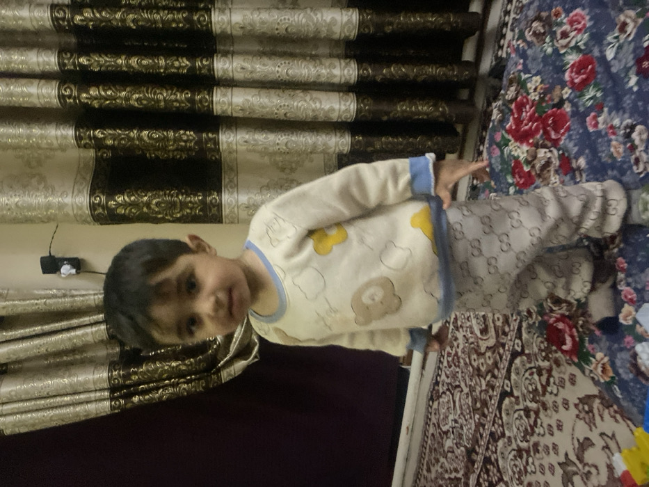 A young child, approximately a toddler, stands facing forward in an indoor residential setting in Galaosiyo, Uzbekistan