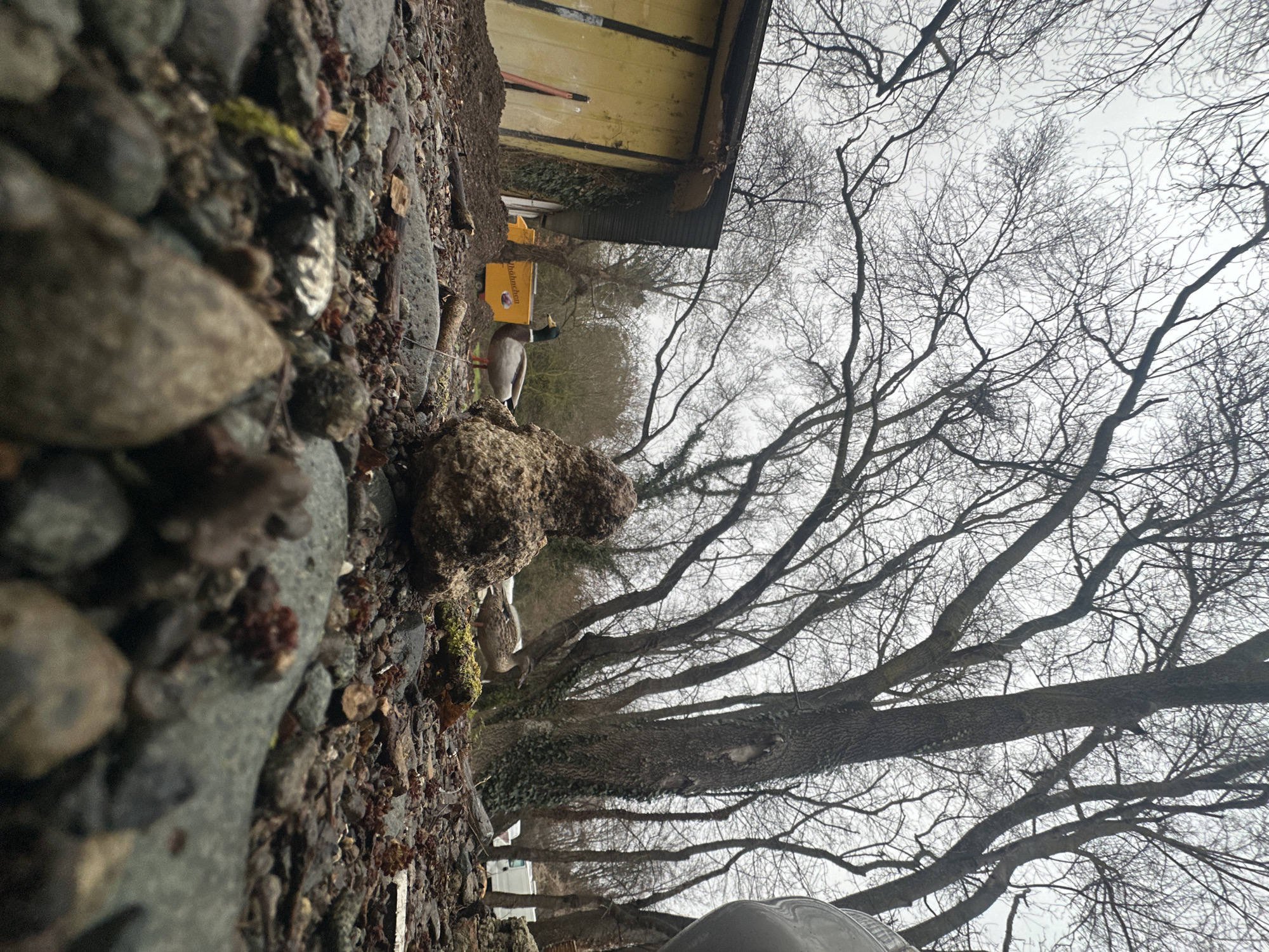 The image presents an outdoor scene at ground level. In the foreground, there is an accumulation of rocks and gravel, intermixed with organic debris like leaves and moss. A tan building with a dark roof is partly visible in the middle ground. A male mallard duck stands next to this building. The background is dominated by bare trees, their branches reaching towards a cloudy sky. The location is likely Kiten, Bulgaria, given the request parameters. No people are visible, and the only action is the presence of the duck.