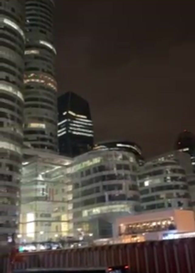 night scene in an urban setting. High-rise buildings dominate the skyline, illuminated against a dark, cloudy sky. The buildings exhibit a range of architectural styles, from cylindrical towers to sleek, modern structures with geometric designs. Some buildings have signage, including the word "TUSK" visible on one. A bus is parked in the foreground, partially obscured by a barrier of orange and brown panels. The environment suggests a construction or development zone. The video appears to be taken from a moving vehicle or handheld device, with slight camera movement and focus shifts.