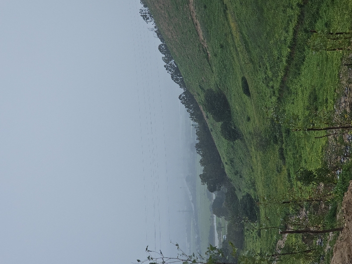 A verdant hillside slopes into a hazy valley under a pale sky. Trees line the ridge and dot the hillside, which is covered in green vegetation. Power lines stretch across the sky. Patches of bare earth are visible. The foreground contains foliage and what appears to be a dirt bank.
