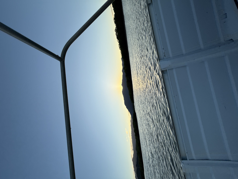 The image presents an outdoor waterscape at either sunrise or sunset, observed from a boat