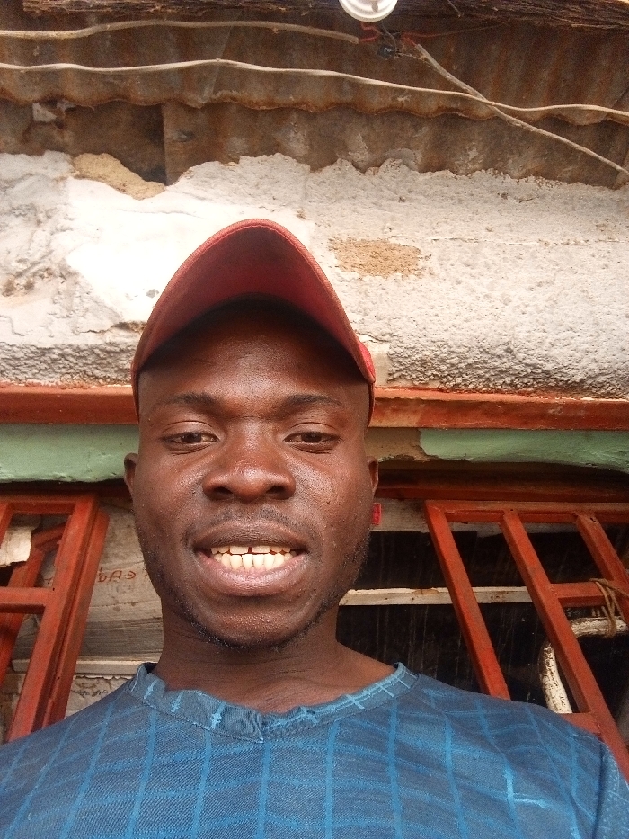 One adult male is depicted in a head and shoulder portrait, centered in the frame. He has a dark complexion, a short beard, and wears a red baseball cap. He is dressed in a blue long-sleeve shirt with a darker grid pattern. His mouth is slightly open, revealing both upper and lower teeth, which show some discoloration. A small red object, possibly an earbud, is visible in his right ear. The background consists of a weathered, light-colored concrete or plaster wall with areas of exposed brown material and a horizontal stripe of faded green paint. Above the wall, multiple layers of corrugated, greyish-brown material are present, likely roofing. A white circular fixture is attached to the corrugated material near the top center. Below the faded green stripe and behind the subject's shoulders, a rusty red metal structure with horizontal and diagonal bars is visible. The scene is situated in Sabon Tasha, Nigeria.