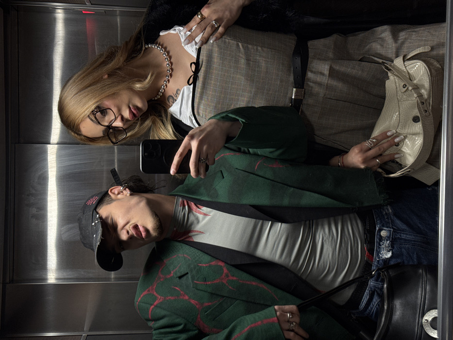 The image depicts two individuals, appearing to be one male and one female, posing for a mirror selfie within an elevator in the city of Asnières-sur-Seine, France. The elevator interior features brushed stainless steel walls. The male subject, positioned on the left, wears a distressed black baseball cap, multiple silver hoop earrings, and a faint goatee. He makes an exaggerated facial expression, squinting his eyes and extending his tongue. He is dressed in a dark green blazer with red flame-like designs, a light grey patterned turtleneck shirt, and distressed dark jeans revealing a dark waistband. A black shoulder bag with a silver crescent buckle is visible on his left. His right hand holds a black smartphone, capturing the image. The female subject, positioned on the right, has long blonde hair and wears large, dark-framed eyeglasses. She is dressed in a black faux fur coat draped over her shoulders, a white ruffled blouse, and a brown and beige plaid bustier-style top with a black ribbon accent. A black belt with a silver buckle cinches her waist above a matching plaid skirt or dress. She wears a silver beaded necklace and multiple rings on her right hand, which is positioned near her chest. Her fingernails are long and painted a light color. She carries a light beige textured handbag in her left hand. Both subjects wear multiple rings. The floor or a lower reflective surface of the elevator reflects the subjects and the smartphone.