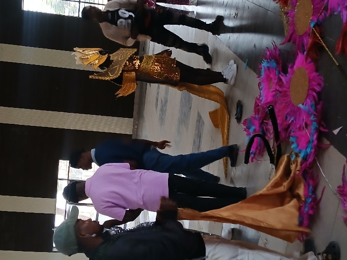The image displays an indoor scene within a large hall in Katon Rikkos, Nigeria. The hall features a tiled floor with a light-colored base and geometric dark patterns, and walls with alternating vertical black and light-colored striped panels. Large windows are visible in the distant background, admitting natural light. Six individuals are present. In the center-right, a person wears an elaborate gold costume consisting of a sequined garment, a substantial gold headpiece, and a flowing gold train. This individual stands on the tiled floor, facing towards the right. To the left foreground, a man in a green baseball cap and a dark jacket holds a piece of gold fabric, observing the costumed individual. Next to him, facing away from the camera, are two men: one in a pink polo shirt and another in a dark blue shirt and jeans. On the far right, another man in a light-colored cardigan and dark shirt is visible. Scattered on the tiled floor in the foreground are several ornate costume pieces composed of vibrant pink and blue feathers, each with a circular gold glitter center. Also visible on the floor are loose sections of gold fabric, including one being held by the man in the green cap, and a pair of black sandals near the feathered pieces. The scene suggests a gathering for an event involving elaborate costuming.