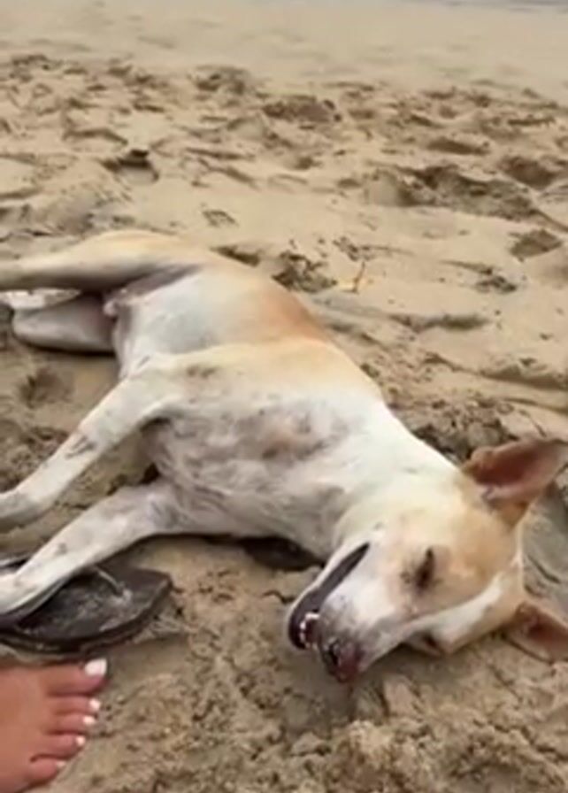 A short video shows a skinny dog lying on its back in the sand at the beach