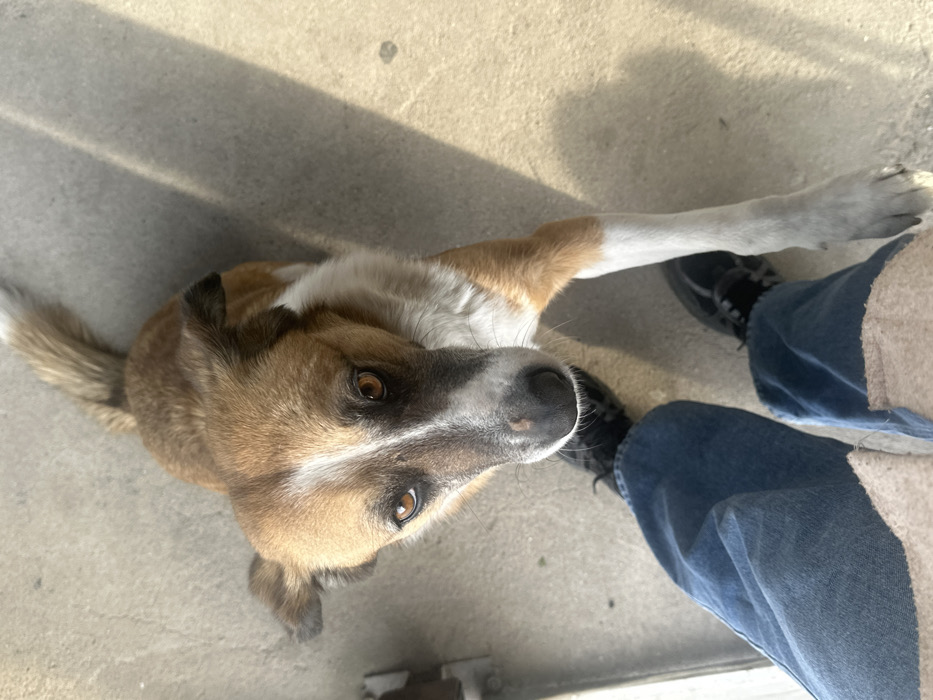 - "An overhead photograph taken in Semchinovo, Bulgaria, depicts a medium-sized, short-haired mixed-breed dog interacting with a person's lower legs and feet on a light grey concrete surface" by FM-RIcHm1, licensed under CC BY 4.0
