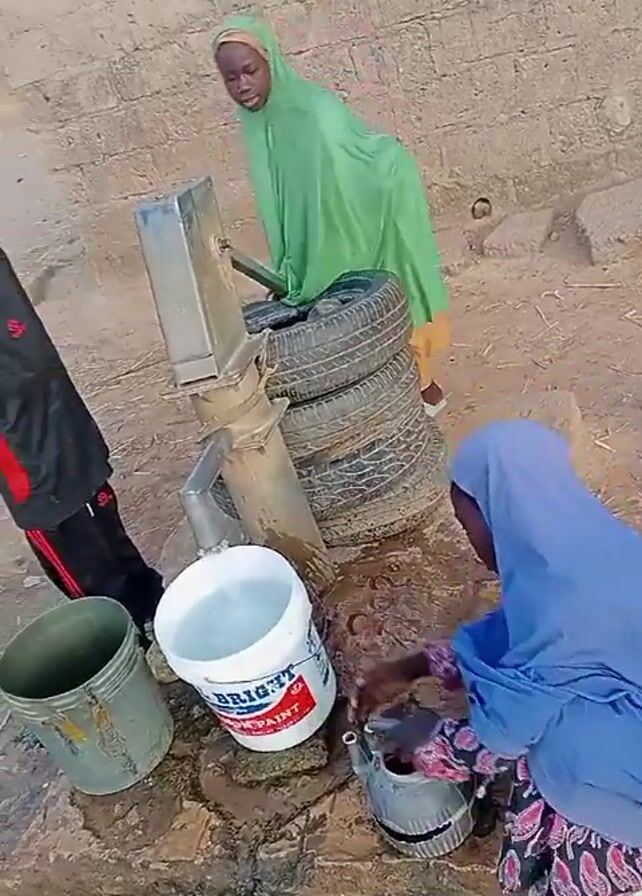 The scene shows a group of children around a water pump. Two girls, one wearing a green hijab and the other a blue hijab, are actively involved. The girl in green is operating the hand pump, drawing water into a white bucket labeled "BRIGHT PAINT". The girl in blue is kneeling down, using a smaller container to transfer water from the larger bucket. A young boy in a black and red tracksuit stands nearby, seemingly watching the activity. Several containers are present, including the white bucket, a gray bucket, and the smaller container being used by the girl in blue. The pump is elevated by a stack of tires. The background features a brick wall and a dirt ground. The area around the pump is wet, suggesting recent use and spilled water.