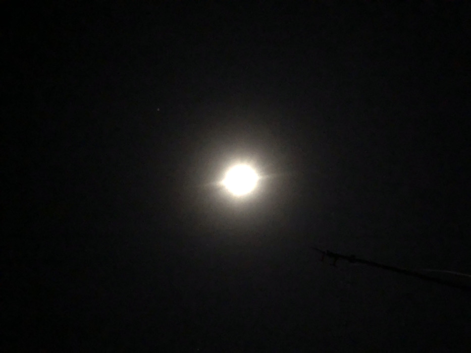A bright, circular moon dominates the center of a dark, night sky. A smaller, fainter star is visible in the upper left. A dark, blurred object, possibly a tree branch or power line, extends from the lower right corner toward the moon, adding a subtle visual element to the otherwise minimalist scene. The overall tone is serene and mysterious.