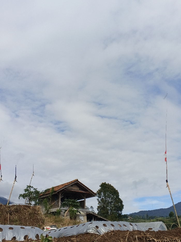 A landscape under a cloudy sky. A small structure with a tiled roof is nestled among trees and foliage. The foreground shows rows of crops covered with plastic mulch. Tall bamboo poles with red and white flags stand near the cultivated land. Distant hills are visible in the background.