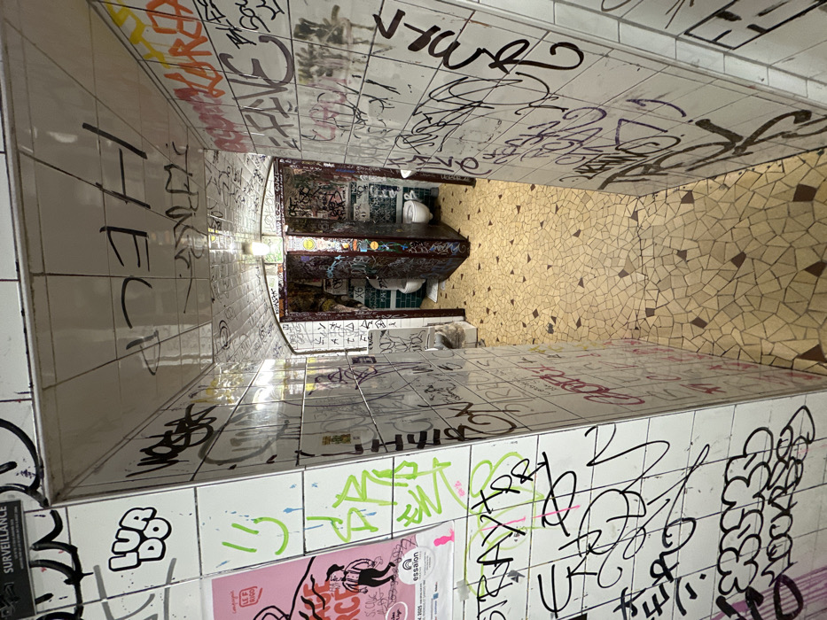 - "An angled view inside a graffitied, tile-lined public restroom" by FM-uovjB3, licensed under CC BY 4.0