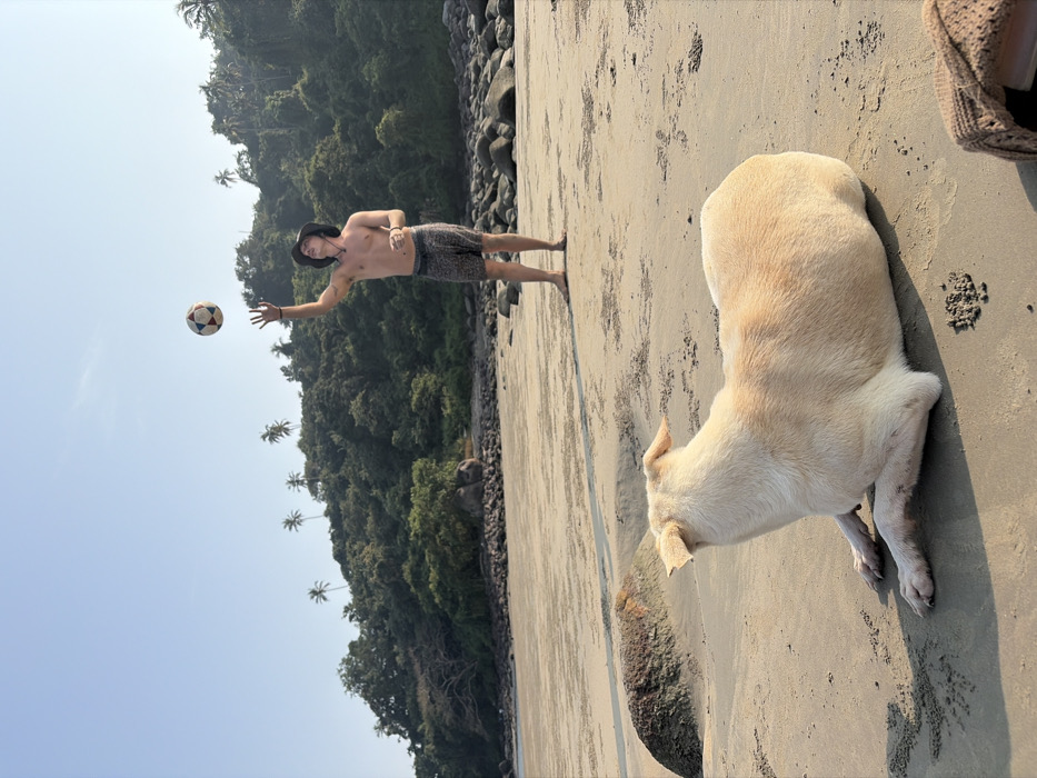 On a sandy beach in Kolamb, India, a light-skinned male stands barefoot, shirtless, wearing dark patterned swim shorts and a dark bucket hat. He is positioned center-right, looking upwards, with his right arm extended, about to catch or having just thrown a multi-colored soccer ball that is airborne above his hand. His left arm is bent at the elbow. In the foreground, lower-left, a light-colored dog with short fur lies on the sand, facing away from the camera and towards the male figure. Small, textured formations in the sand, possibly from crab activity, are visible around the dog and in the middle ground. In the far background, a lush green hill covered with dense vegetation and several prominent palm trees rises against a clear, light blue sky. Dark rocks are scattered along the base of the hill and extending onto the beach in the midground, particularly on the right side. A partially visible woven bag is present in the lower right corner of the frame.