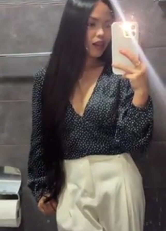 A woman is taking a mirror selfie in a bathroom. She's holding a white smartphone in her right hand, angled slightly upward. The phone's screen is obscured by a lens flare. She's wearing a long-sleeved, deep-V blouse with white polka dots, and high-waisted white trousers. She has long, straight, black hair. The bathroom has gray tile walls, a chrome towel rack, a white toilet paper dispenser, and a white sink. Background voices can be heard.