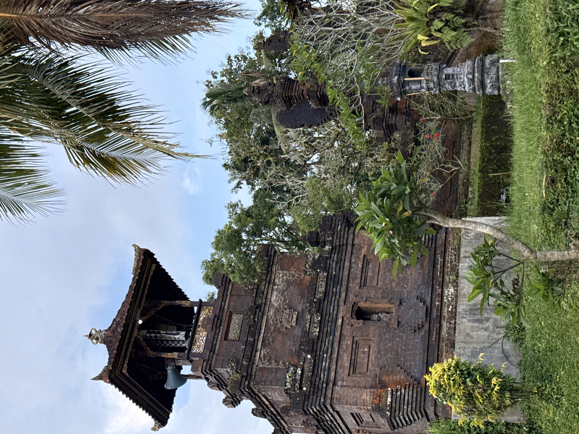 The image showcases a traditional brick tower or temple structure, possibly a part of a historical site or monument, against a backdrop of a partly cloudy sky. The tower is multi-tiered and decorated with intricate carvings. It appears to be weathered, hinting at its age. A bell can be seen hanging inside a section of the tower. The immediate surroundings include a variety of vegetation – trees, shrubs, and grass. Palm leaves are partially visible in the frame's upper corner. The location is likely Marga, Indonesia, based on the architectural style of the tower.