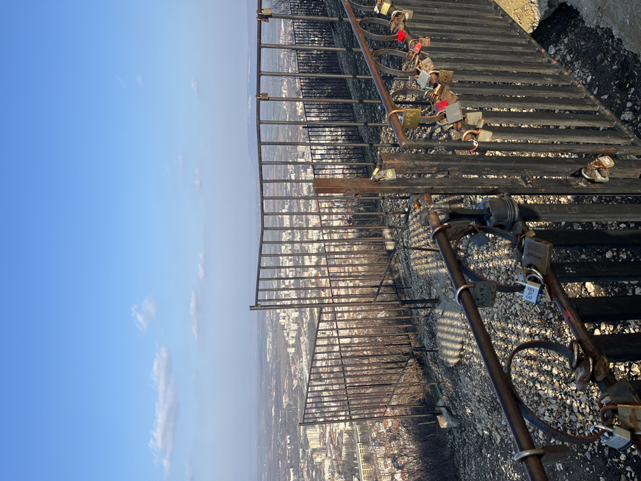 The image depicts a panoramic view of the city of Shumen, Bulgaria, from a high vantage point on a hill or plateau overlooking the urban area. In the foreground, dark, painted metal railings, constructed from vertical bars and horizontal supports, span the lower and mid-right sections of the frame. Numerous metallic padlocks, commonly known as "love locks," are affixed to the horizontal bars of these railings. These locks vary in size, color (including brass, silver-toned, red, and blue), and condition, with some exhibiting signs of weathering and rust. One distinctive object, appearing to be an engine piston, is also secured to a horizontal bar on the left side of the foreground railing. The ground immediately below the railings is rugged, consisting of light-colored rocks, gravel, and sparse, dry vegetation. Long shadows, cast by the railings, extend across this ground, indicating a low sun angle. Beyond the foreground railings, the terrain slopes downwards, revealing the extensive urban sprawl of Shumen. The city is characterized by densely packed buildings, primarily residential structures with varying roof colors (including reddish-orange and lighter tones), interspersed with some visible green areas. Further in the midground, beyond the central city, are more scattered structures and what appear to be agricultural fields or forested areas. The background features a clear, bright blue sky with a few scattered white cumulus clouds. On the distant horizon, hazy blue hills or mountains are visible under atmospheric conditions. No individuals are present in the scene.