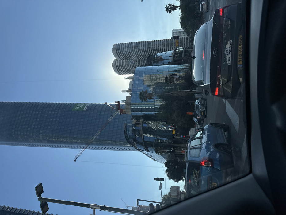 An urban scene captured from inside a car shows a city street with traffic. Tall, modern skyscrapers dominate the background, one under construction with a crane visible. The sun shines brightly between two buildings. A blue station wagon is on the left and a black sedan in front of the camera. Traffic lights and street signs are visible, indicating an active intersection.