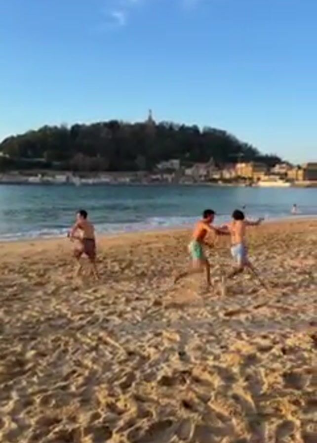 Four shirtless men are playing on a beach. Three of the men are chasing the fourth, who has the object they are chasing. The chase moves away from the camera towards the water. The beach is sandy, and there is a green, tree-covered hill in the background, with buildings along the water in front of it. The sky is blue, with some clouds.
