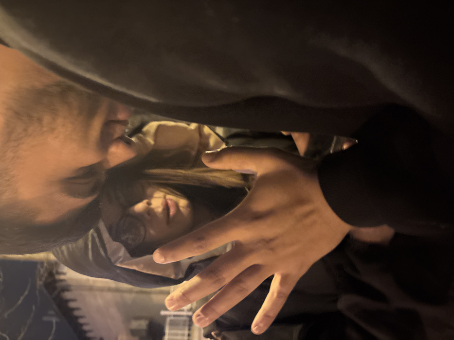 The scene is depicted in the city of Sliven, Bulgaria, during low light conditions. Three individuals are present. In the immediate foreground, a light-skinned human hand, palm open with fingers spread, extends centrally from the right side of the frame. This hand belongs to an individual whose dark-sleeved arm and upper torso are visible on the right, with the head and face out of frame. Behind the extended hand, a female individual is visible, wearing a dark hooded garment with the hood up and dark-framed eyeglasses. She has long, straight dark hair, and her mouth is slightly open. Her gaze is directed towards the extended hand. Partially obscured behind this female and to her right, another individual is faintly visible, wearing a light-colored garment. The background consists of indistinct urban architectural features, including a light-colored railing or fence on the left and a corrugated or textured roofline above it. Ambient lighting illuminates the scene, with the foreground hand appearing brighter than the surrounding environment.