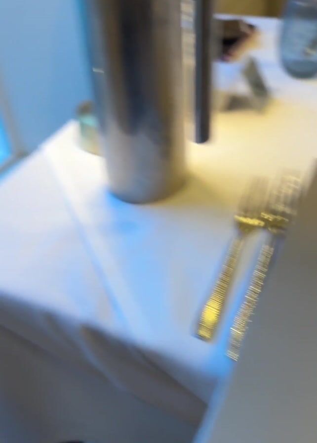 table in a restaurant with a view of a rainy landscape. The table is set with cutlery, glassware, and a menu from a place called “Inn on the Lake”. The camera pans to a window revealing an outdoor patio area with tables and chairs, all wet from the rain. In the distance, there are mountains shrouded in mist, along with a gazebo near a body of water, likely a lake. The overall environment suggests a serene, though wet, dining experience.