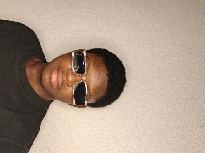 A person with dark skin and short, dark hair is wearing sunglasses with a clear frame and black lenses. The person is wearing a dark shirt. The background appears to be a light-colored wall. The image is rotated sideways.
