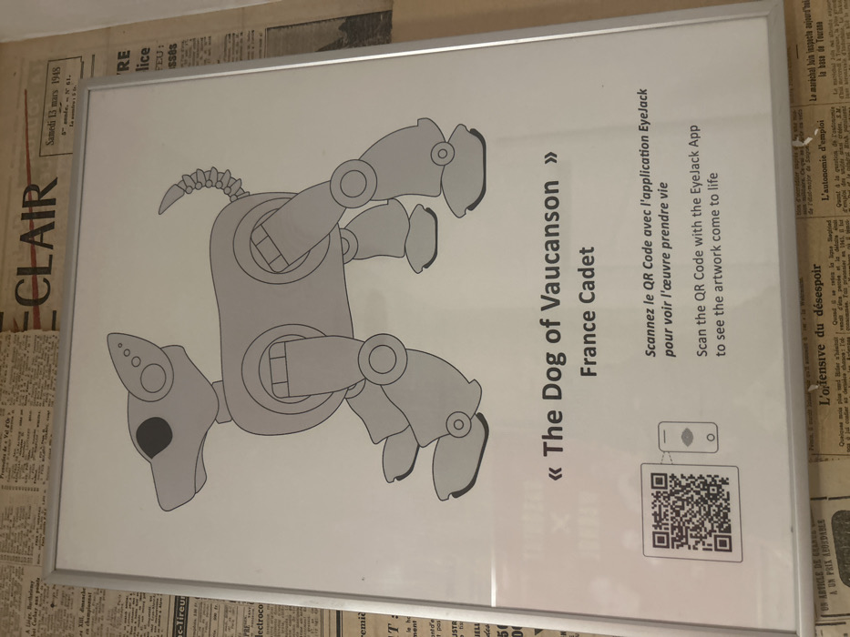 This image depicts a framed poster displayed on a wall in Cucuron, France. The poster, vertically oriented and encased in a light metallic frame, features an illustration of a stylized, grey, robotic dog with black eyes and segmented limbs, joints, and a coiled tail. The dog is presented in a standing or walking posture, facing left. Below the illustration, the text reads "« The Dog of Vaucanson »" and "France Cadet." In the lower left corner, a QR code is visible next to a small graphic of a smartphone screen displaying a red lip icon. Accompanying text, in both French and English, instructs viewers to "Scan the QR Code with the EyeJack App to see the artwork come to life." The wall behind the poster is covered entirely with aged newspaper clippings, revealing headlines such as "ECLAIR" and a date stamp indicating "Samedi 13 Mars 1948." No individuals, explicit actions, or direct interactions are captured in the scene.