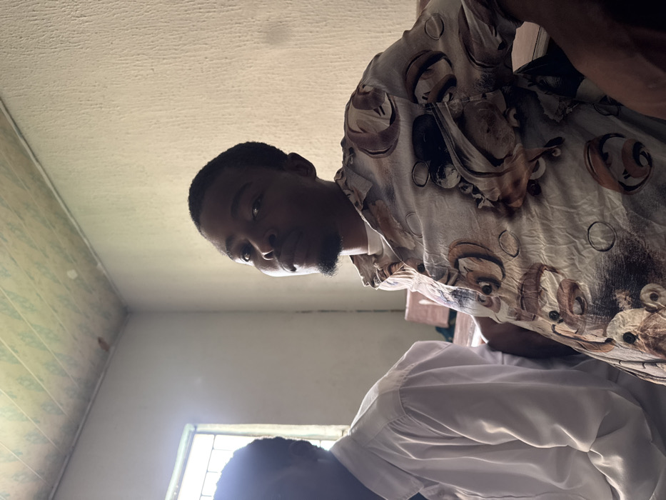 The image depicts an indoor scene in Osu, Nigeria, featuring two Black males