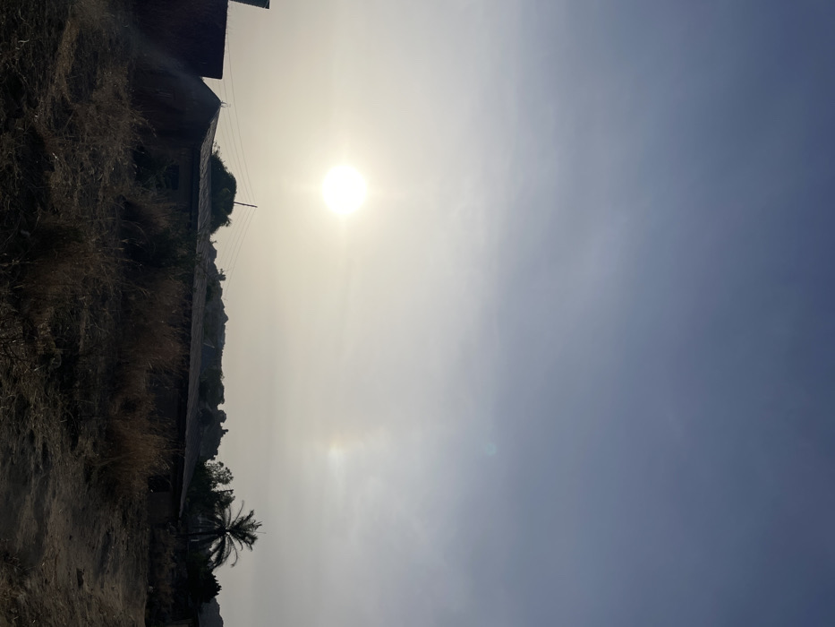 The image depicts an expansive, hazy sky dominating the upper two-thirds of the frame over a semi-arid landscape on Rukuba Road, Nigeria. The sun, a bright white orb, is prominently positioned in the upper left quadrant, exhibiting a distinct sun glare. To the right of the sun, a faint parhelion (sun dog) is visible in the sky. The lower third of the image shows the foreground consisting of dry, yellowish-brown grass and sparse vegetation, with exposed dark earth and an unpaved dirt path extending from the lower right towards the center. In the midground, several low-rise structures with dark, possibly corrugated iron, roofs are partially visible. These buildings appear somewhat obscured by shadows or their construction materials. A utility pole with overhead lines extends upwards from behind these structures on the left side. Behind the buildings, scattered green foliage and a prominent, tall palm tree with a dark frond canopy are visible on the right. In the far background, rocky outcrops and hills define the horizon line beneath the hazy sky. No individuals or discernible activities are observed. The scene suggests a rural or semi-urban environment during daylight hours, characterized by dry conditions and diffuse sunlight.