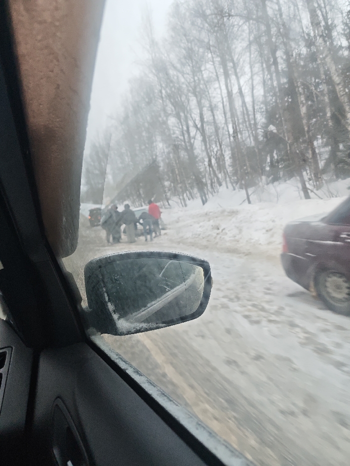 The image presents a winter road scene in Dmitrov, Russia, viewed from inside a vehicle through its front passenger-side window. The left side of the frame shows the vehicle's interior trim, lightly covered in frost. A dark red sedan is stopped on the right shoulder of the snow and slush-covered road. In the mid-ground, approximately five individuals, dressed in winter clothing, are gathered around a light-colored vehicle, likely a sedan, which is positioned centrally on the road. One person among this group is distinctly visible in a red jacket. Their collective activity appears focused on the light-colored vehicle, suggesting efforts related to it being stuck or disabled. Further ahead on the road, another dark vehicle is partially discernible. The side-view mirror of the observer's vehicle, covered in frost and featuring a crack on its upper left glass, is prominent in the lower-left foreground, reflecting a blurred image of the snowy road. Tall, bare deciduous trees line a snow-covered slope along the right side of the road under a hazy, overcast sky.