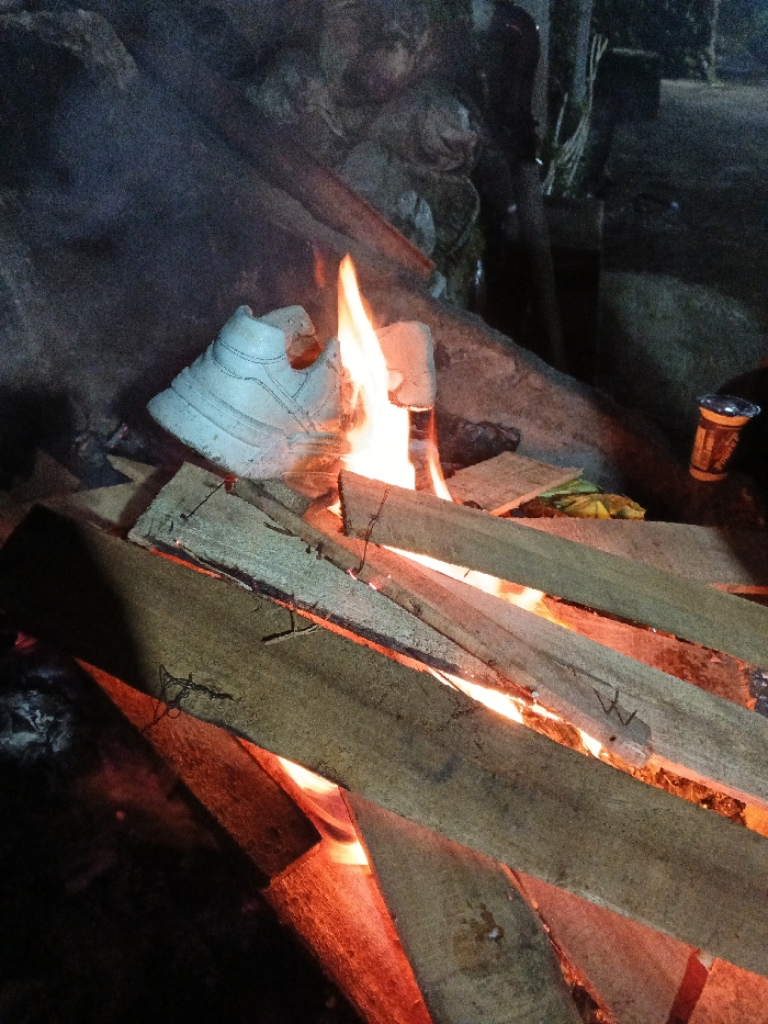 This image depicts an outdoor night scene in Bien Hoa, Vietnam, centered on a localized fire. A single light-colored, possibly white, athletic shoe or sneaker is positioned directly within the flames, showing signs of active combustion and structural degradation. The fire is fueled by several wooden planks of varying lengths and widths, some of which contain embedded metal staples. Bright orange and yellow flames are visible, casting strong illumination and shadows. Smoke emanates from the burning materials, particularly from the shoe. In the upper right background, a translucent orange plastic cup, possibly containing a beverage, is visible resting on an indistinct surface. The background is predominantly dark, suggesting a nighttime environment, with vague shapes that could be vegetation or structures. No individuals are visible.