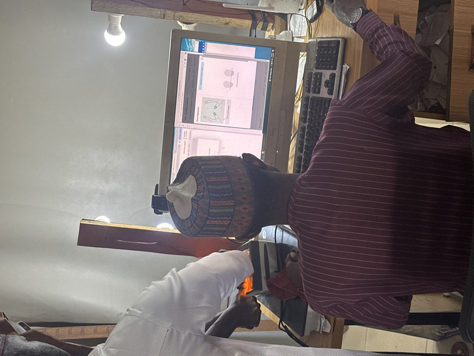 The scene depicts an indoor workstation in Unguwar Rimi, Nigeria