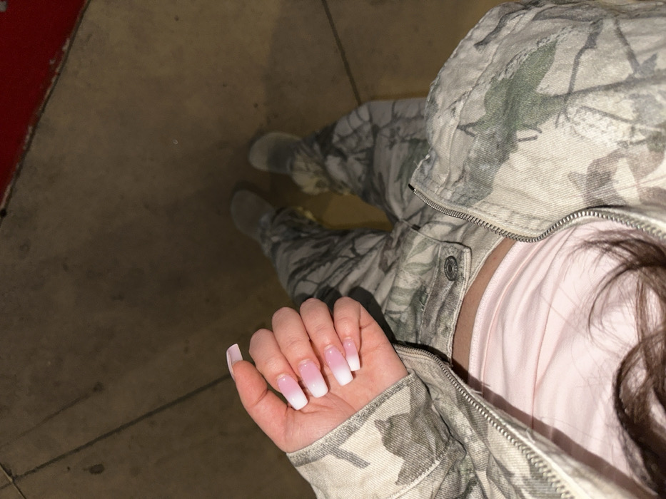 This image captures a downward-angled view of an individual in Las Vegas, United States. The scene shows the person's upper torso, legs, and feet. The subject is wearing a camouflage-patterned jacket featuring light green, gray, and white tones, with a visible metallic zipper and snap buttons. Beneath the jacket, a light pink top, possibly a crop top, is visible, exposing a segment of the abdomen. The individual's legs are clad in camouflage-patterned pants matching the jacket. Light brown or gray, potentially fur-lined, boots are worn on the feet. The left hand is prominent in the foreground, displaying manicured nails that are medium-length, square-shaped, and feature an ombre French tip design transitioning from a clear/pink base to white tips. Dark brown hair is partially visible at the bottom center of the frame. The immediate environment consists of a flat, untextured, dull brown/gray ground surface, likely concrete or asphalt. A thin red strip is discernible along the top edge of the frame, suggesting a nearby structural element or marking. The lighting in the scene appears dim.