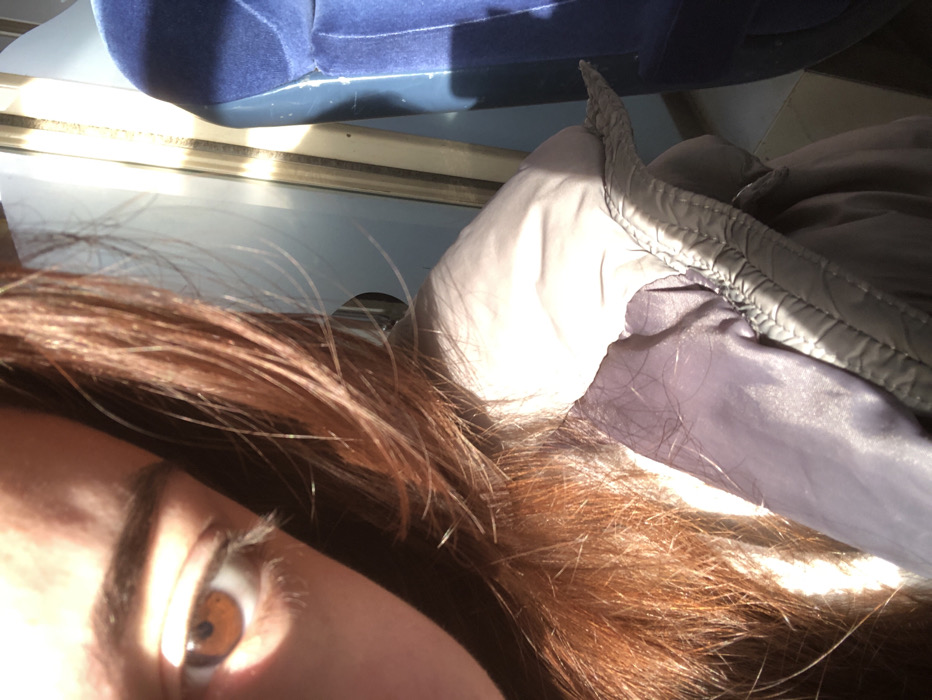 The image presents a close-up, angled view of an individual positioned inside a vehicle in Dettwiller, France. The left side of the subject's face is visible, featuring a brown left eye with a dark pupil and defined eyelashes, partially in shadow. Reddish-brown hair, illuminated by direct sunlight, frames the face and extends across the left side of the frame. The individual wears a light gray or lavender padded jacket, the upper portion of which shows a distinct textured seam. To the right, a section of a blue upholstered seat is visible, indicating an interior setting consistent with a train or bus cabin. Strong natural light enters from the right, casting bright highlights on the subject's hair and jacket and creating vertical light patterns on the internal window structure. The individual's gaze is directed forward, seemingly towards the camera.