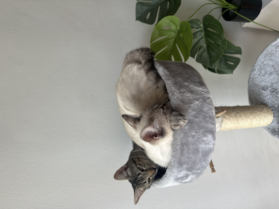 - "The image displays two domestic cats resting within the top level of a grey, plush cat tree" by FM-zyjiK2, licensed under CC BY 4.0