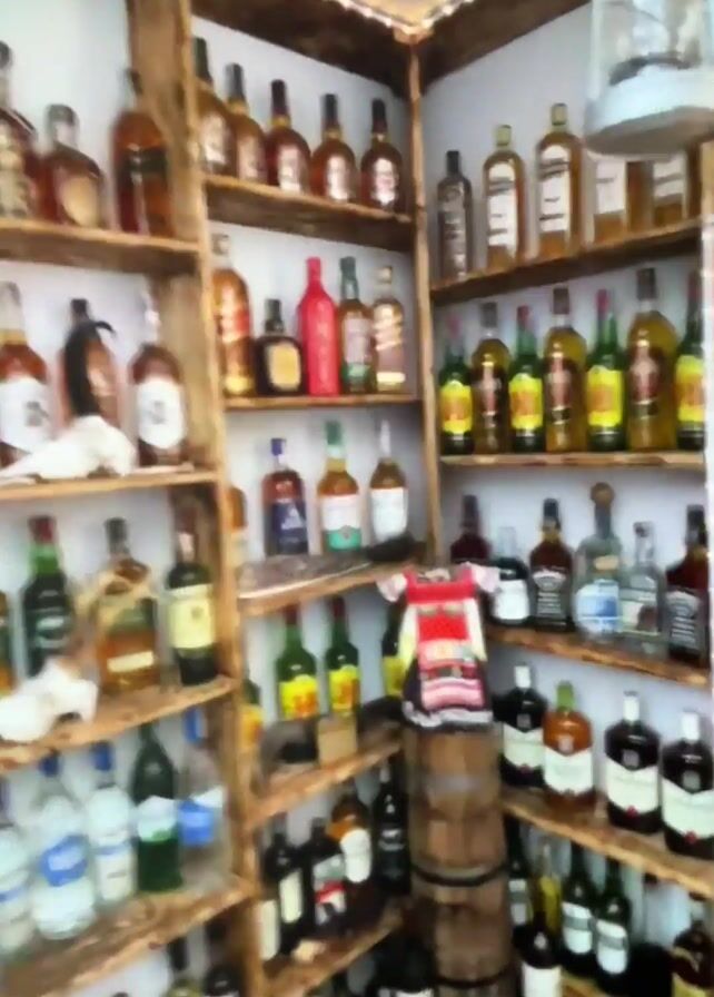 A corner home bar is shown. The bar is constructed with wooden shelves. The shelves are filled with various types of liquor bottles. An old-fashioned lantern hangs from the ceiling above the corner of the shelves. Some white cloths or towels are draped on a shelf. A small wooden barrel is nestled in the corner of the shelves. The room is lit by LED strip lights along the top of the shelves.