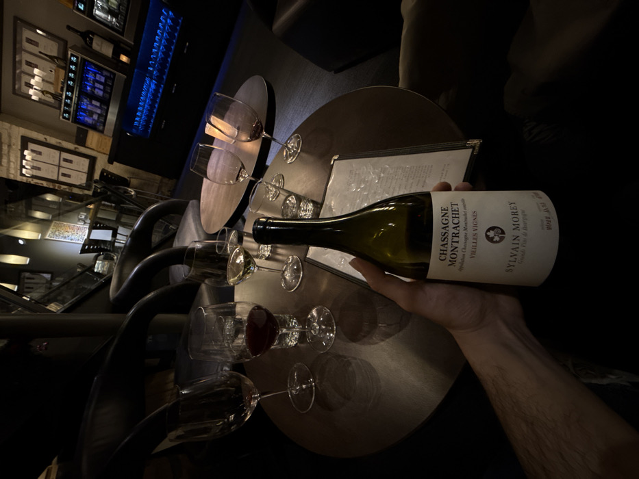 bottle of Sylvain Morey Chassagne-Montrachet wine held over a table with several wine glasses. Some glasses appear to have red wine, while others are empty. A menu lies on the table. The setting appears to be a dimly lit wine bar, with wine display cases and other tables visible in the background.