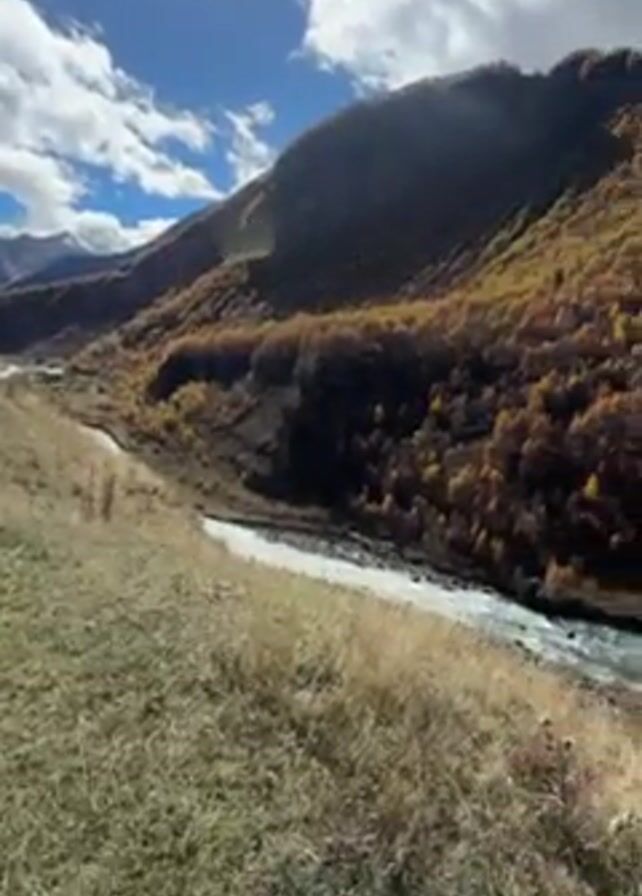 scenic view of a mountain valley. A river flows along the valley floor, with tall mountains rising on either side. The mountains are covered in trees with yellowing autumn foliage, interspersed with rocky cliffs. The sky is blue with scattered white clouds, and the sun is shining brightly. The foreground features grassy terrain, providing a natural viewpoint for the scene. The video presents a landscape shot capturing the natural beauty of the mountain valley in the autumn season.
