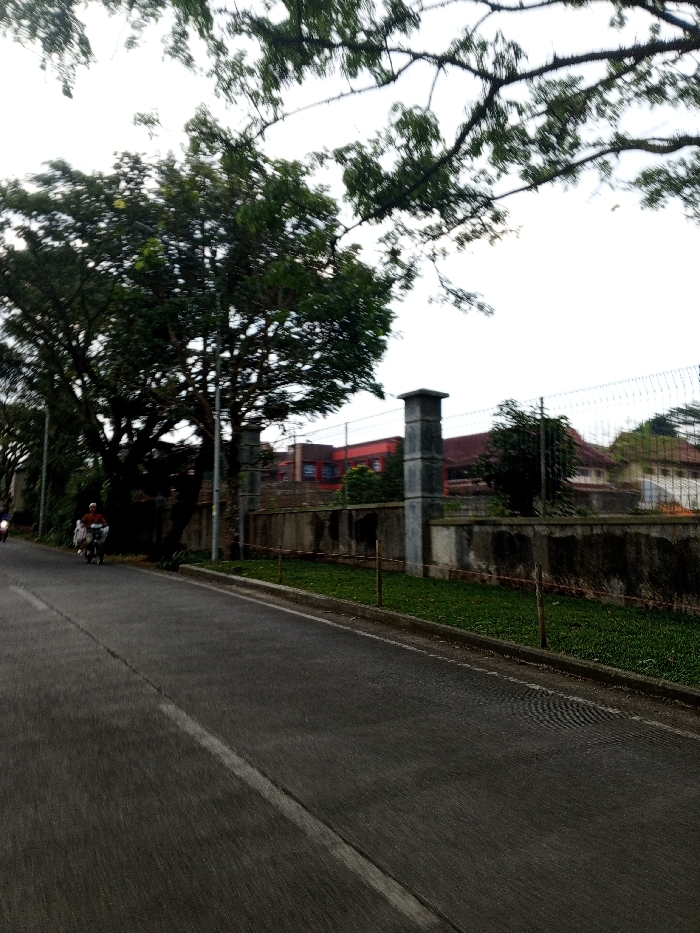 The image presents an outdoor street scene in Kheda, India, under an overcast sky. A gray asphalt road, featuring a single white continuous line along its left side, recedes into the background, showing blur consistent with motion. On the road's left side, a person wearing a reddish-brown top is operating a white motor scooter or motorcycle, which has a large white object or package secured to its front. This vehicle is in motion, heading away from the viewer. Further down the road on the same side, a second, partially obscured motor vehicle is visible. A line of large, dense green trees borders the left side of the road, with some branches extending into the upper left portion of the frame. A dark street light pole is situated among these trees. The right side of the road is delineated by a weathered, low concrete wall topped with a wire mesh fence. Behind this barrier, a strip of green grass is visible. Two rectangular concrete pillars are integrated into the wall structure, with one prominently featured in the mid-right. Beyond the fence, several buildings are discernible, including a prominent structure with a red facade and a dark roof, along with other buildings further to the right. Tree branches with green leaves overhang the upper right quadrant of the image.