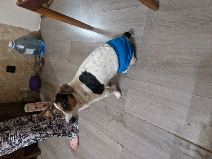 The image depicts an indoor domestic scene in Svilengrad, Bulgaria. In the foreground, a tan, black, and white Jack Russell Terrier-type dog sits on a light grey wood-look floor, facing left. The dog wears a bright blue sanitary garment or diaper covering its hindquarters. Its right ear is folded, and it has a black patch on its left side. To the left, a person's lower legs and bare feet are visible, standing on the same flooring; they are wearing patterned black and white trousers. Behind the dog and person's feet, a white and red "Yoogu Strawberry Raspberry" juice box is visible. In the background, against a light-colored, textured wall, a large clear plastic water bottle with blue liquid is present, alongside a small purple bowl and a smaller brown bowl or dish. A dark square object, possibly an electrical outlet, is on the wall. To the right, a wooden furniture leg is partially visible.