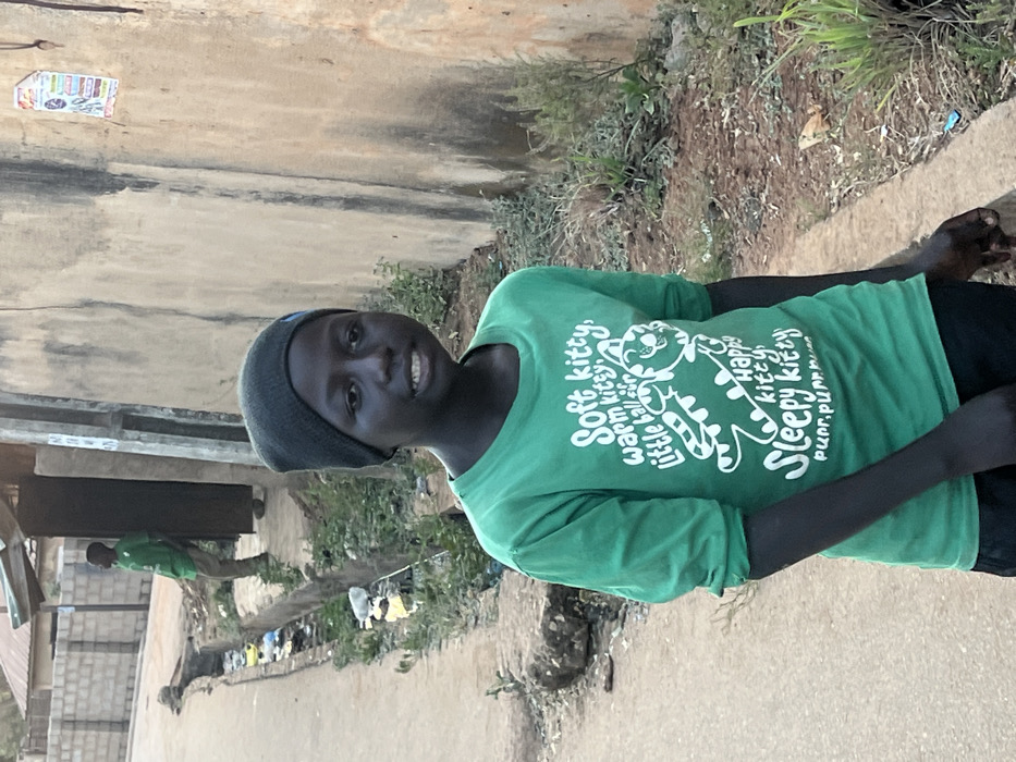 The image presents an outdoor street scene in Kirana, Nigeria, under natural daylight. A young individual with dark skin, wearing a dark grey beanie and a long-sleeved green t-shirt with white "Soft kitty, warm kitty, little ball of fur. Happy kitty, sleepy kitty, purr, purr, purr" text and a cat graphic, stands in the foreground on an unpaved dirt path. This individual is positioned slightly left of center, looking towards the camera with a slight smile revealing teeth. To the immediate right of the foreground subject, the ground consists of dry dirt with sparse green vegetation, leading to a tall, light beige wall exhibiting dark vertical streaks and a small white poster affixed to its upper right section. To the left of the foreground individual, a concrete curb separates the main path from a narrow, shallow ditch containing visible plastic bags and other refuse, bordered by sparse vegetation. Further back on the left, another individual in a green shirt and light-colored pants is visible, standing on a raised concrete platform next to an open, dark doorway. This person is oriented to the left, away from the camera. A low wall constructed from grey concrete blocks is present in the mid-ground behind them, and a corrugated metal roof is visible in the distant background.