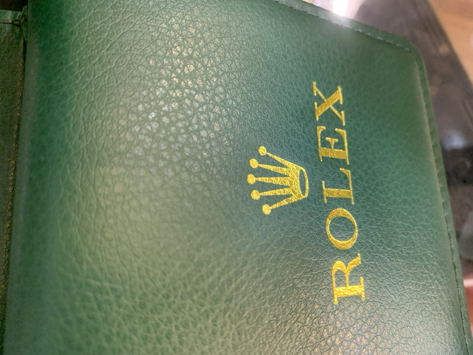 A close-up, angled overhead shot captures a dark green, pebbled-texture material, consistent with leather or faux leather, located in Barza Municipality, Syria. The material features an embossed, gold-colored "ROLEX" text, inverted relative to the primary image orientation, positioned above a similarly embossed gold Rolex crown logo. The letters 'R' and 'O' of "ROLEX" are visible on the right, while 'L', 'E', 'X' are on the left, forming "XELOR" when viewed left-to-right as depicted. The surface exhibits specular highlights, particularly towards the upper-left and lower-right, suggesting an indoor, possibly artificially lit environment. No individuals or active interactions are visible in the frame.