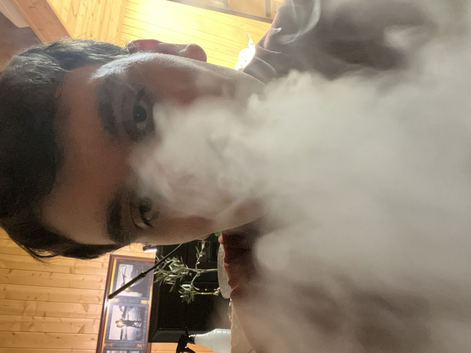 - "A close-up image shows a male individual, from the mid-forehead upwards to the top of the head and shoulders, exhaling a large, dense cloud of white vapor that obscures the lower portion of his face, including the mouth and nose" by FM-HXrzC3, licensed under CC BY 4.0