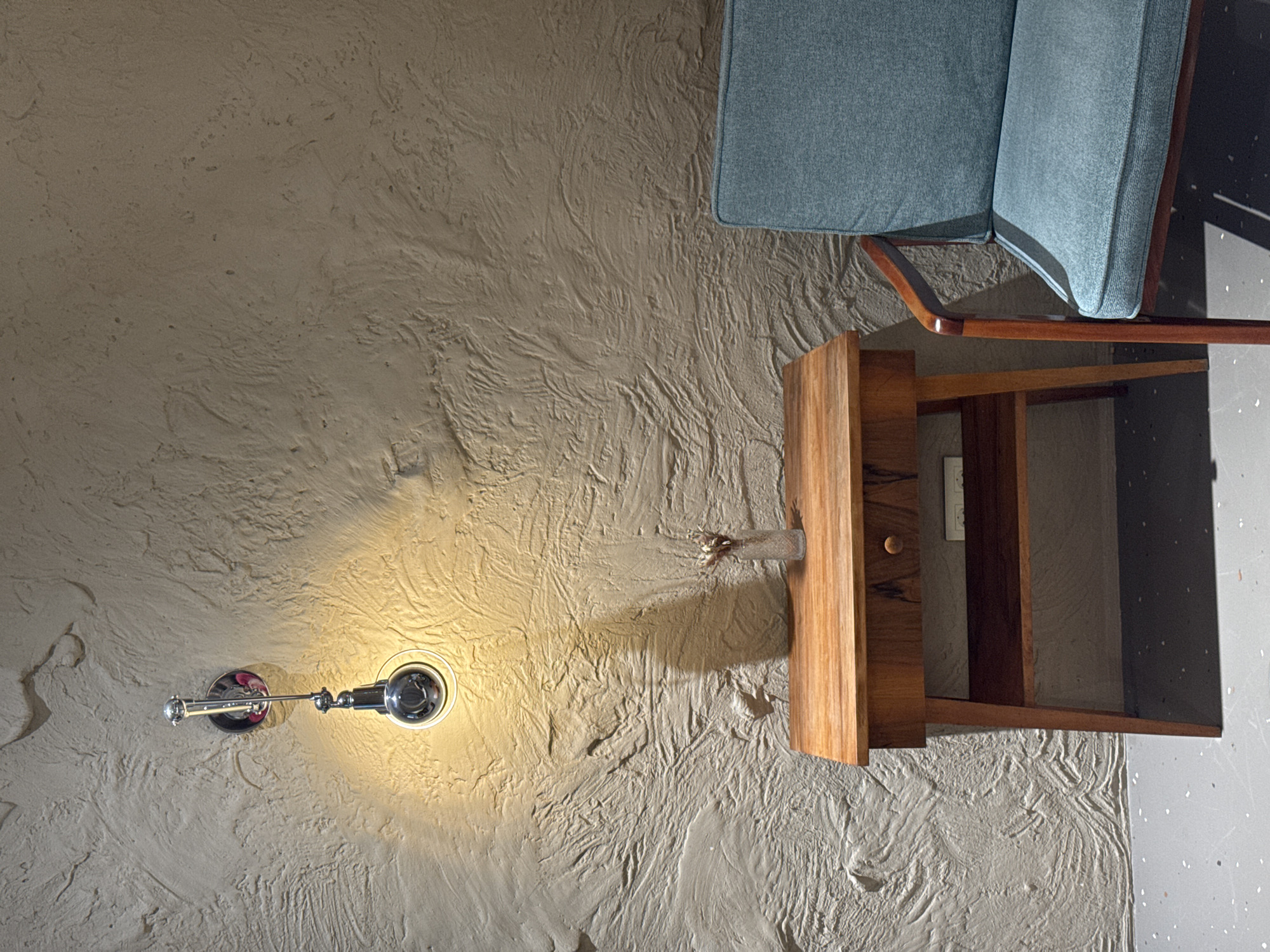The image presents an interior scene with several elements. A light fixture, possibly a wall-mounted lamp, casts a bright glow on a textured wall with a stucco or plaster finish. Adjacent to the wall is a mid-century modern style wooden side table. On the table sits a glass vase. Also visible is a light-blue upholstered chair, situated to the right and above the side table in the frame. The environment appears to be indoors, possibly in a living room or sitting area. There is no indication that this image is located in Azov, Russia.