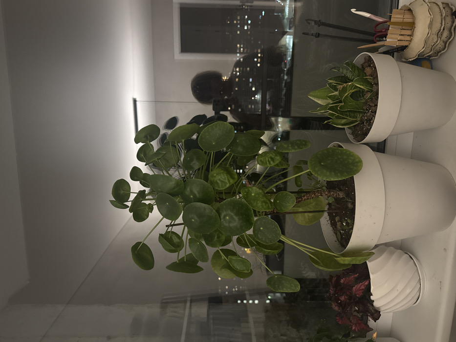 Three potted plants sit on a windowsill. The largest, a pilea peperomioides, dominates the view with its circular leaves. Above it, a smaller plant with variegated green and white foliage resides in a similar white pot. Below and to the right of the pilea, a begonia in a uniquely textured white pot completes the arrangement. A collection of craft tools rests near the top plant. The window reflects a person holding a camera and city lights.