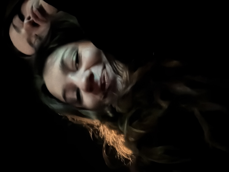 A photograph in low light features two faces. The primary face, angled, has light skin, brown hair, and a slight smile. The features are somewhat blurred. A second face, smaller and darker, is located in the upper left corner. The background is entirely black. Light glints off the ends of the primary figure’s hair. The overall impression is one of motion or a distorted perspective.