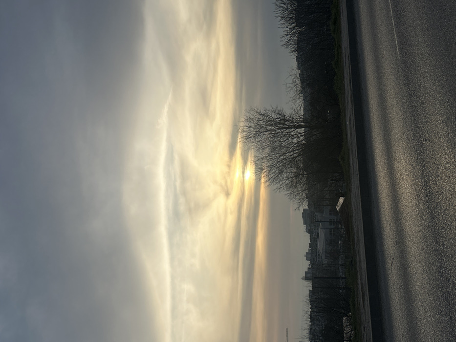 The scene depicts an elevated panoramic view overlooking the city of Varna, Bulgaria, at either sunrise or sunset. The sky occupies the upper two-thirds of the frame, transitioning from a dark grey overcast in the uppermost section to a horizontal band of yellowish-orange stratiform clouds in the middle, where the sun is visible as a bright, partially obscured disc in the upper-right portion, emitting subtle crepuscular rays. Below the sky, a dark, silhouetted line of bare deciduous trees and shrubs forms the immediate midground. Beyond this vegetation, the Varna cityscape is visible, characterized by multiple low-to-mid-rise buildings under a hazy atmosphere. A body of water, consistent with the Black Sea, is faintly discernible on the far left horizon. The foreground consists of a dark asphalt road surface, appearing damp or reflective, with elongated horizontal shadows extending across it from left to right. No individuals or vehicles are present in the observable area.
